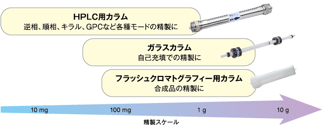 ワイエムシィでは、シリカゲル・ODSをはじめ様々な充填剤について分析用から分取用まで各サイズのカラムをラインナップしているため、LC-Forte/R-IIと合わせて、各種モードの精製が可能です。