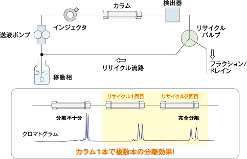 また、リサイクル中は移動相を循環させるため、分取時の溶媒消費量を削減できます。
