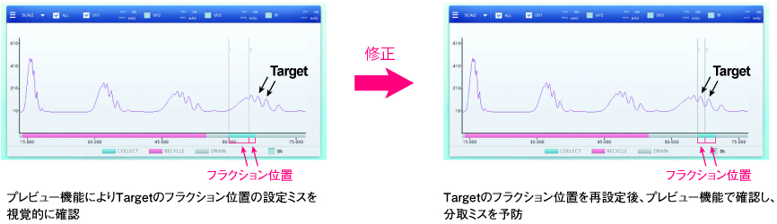 また、リサイクル分取などの複雑な分取条件では、フラクション位置の設定ミスによるサンプルロスが生じてしまう可能性がありますが、プレビュー機能を使用することで正確なリサイクルやフラクション位置の把握ができ、確実な分取精製が可能です。