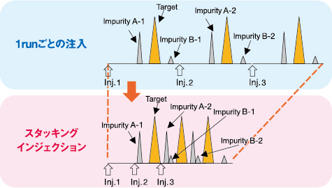 スタッキングインジェクションは、試料を連続的に注入し、ターゲット化合物以外の溶出ピークをオーバーラップさせて分取を行う手法です。試料注入からピークが溶出されるまでの時間が長い場合などに有効で、分取時間と溶媒消費量を削減することができます。